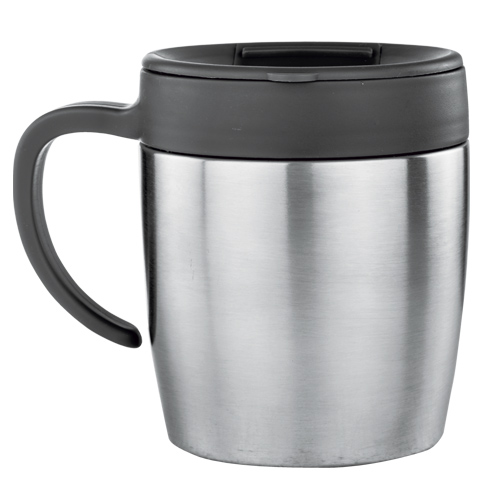 - Descripción: Taza térmica con doble pared de acero inoxidable, tapa enroscable, asa de plástico y válvula de seguridad.